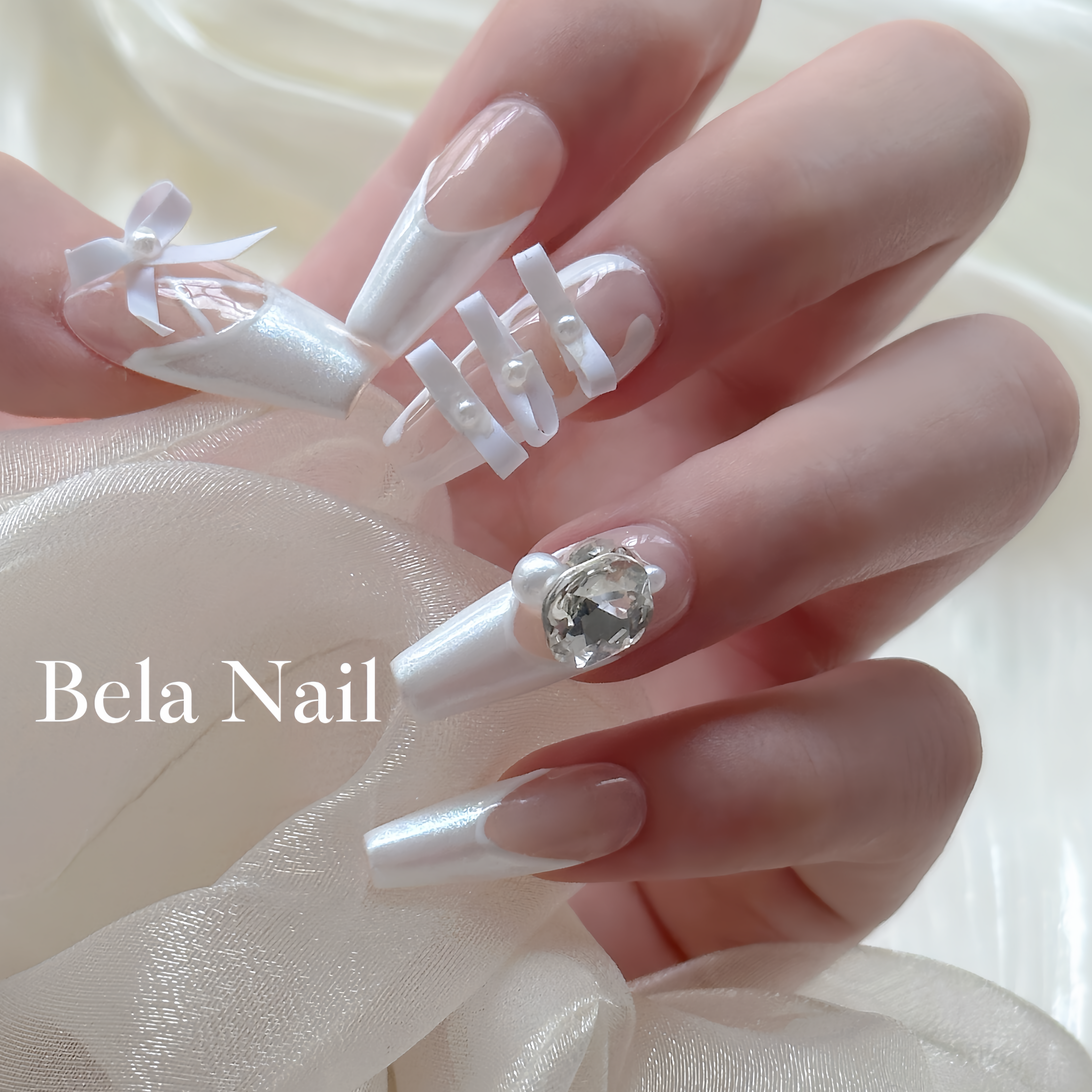 white medium coffin bowknot gemstone pearl handmade press on nails